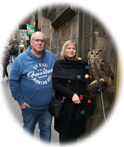 David, Carolyn and Eurasian Eagle-Owl on the Royal Mile, Edinburgh