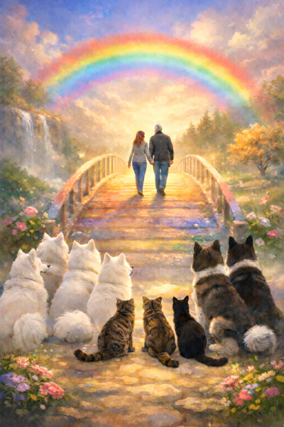 All the animals who had been ill and old are restored to health and vigour. Those who were hurt or maimed are made whole and strong again, just as we remember them in our dreams of days and times gone by. The animals are happy and content, except for one small thing; they each miss someone very special to them, who had to be left behind.