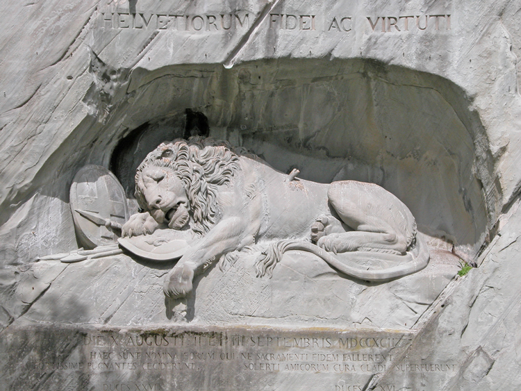 A visit to Lucerne wouldn’t be complete without seeing the Lion Monument—the Lion of Lucerne—resting in his lair in a quiet, idyllic park right in the heart of the city. Carved directly into a rock face, this striking 10-by-6-metre sculpture (unveiled in 1821) was created in honour of the Swiss Guards who died during the Storming of the Tuileries in Paris in 1792.